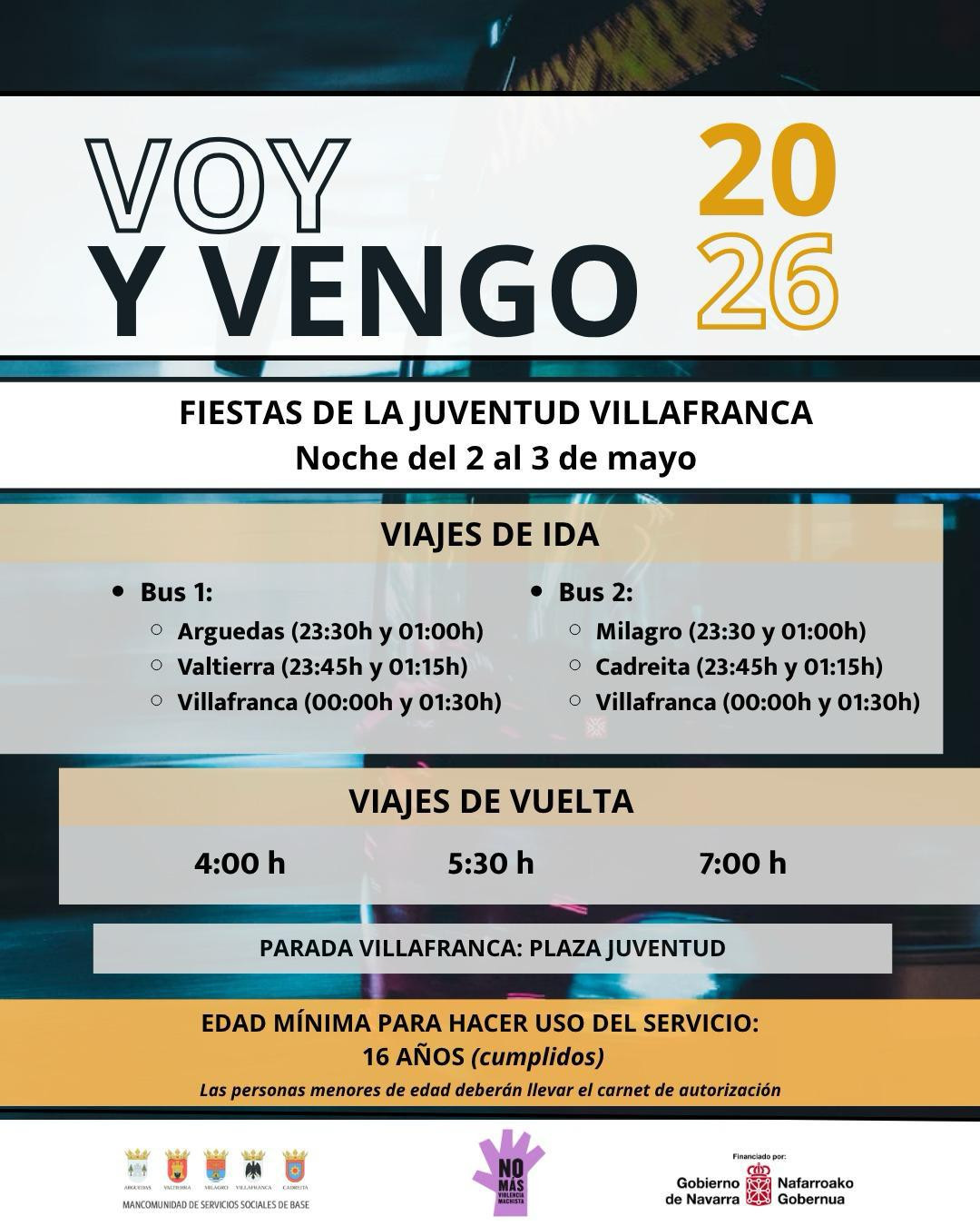 Con motivo de las Fiestas de la Juventud de Villafranca, la noche del 2 al 3 de mayo, se pone en marcha el servicio de autobús “Voy y Vengo"
